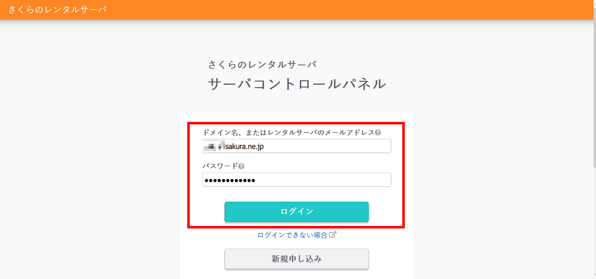 サーバコントロールパネルというサーバーの設定変更画面にログインします。契約時に送付されたドメイン名とパスワードを入力して「ログイン」ボタンをクリックします: