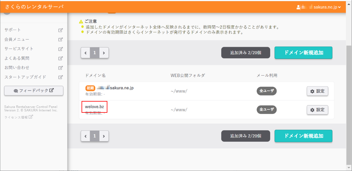 するとドメイン/SSL の画面に戻り、指定したドメインが追加されていることを確認します: