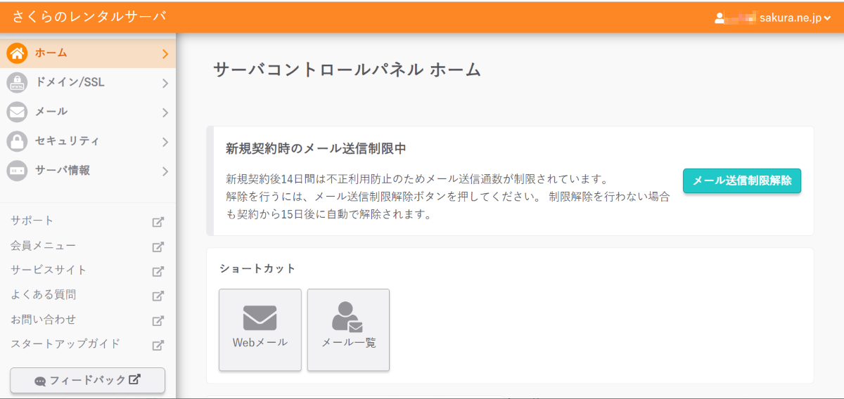 ログインに成功すると以下のような「サーバコントロールパネル ホーム」画面が表示されます。ここから独自ドメインを利用するための設定を行っていきます: