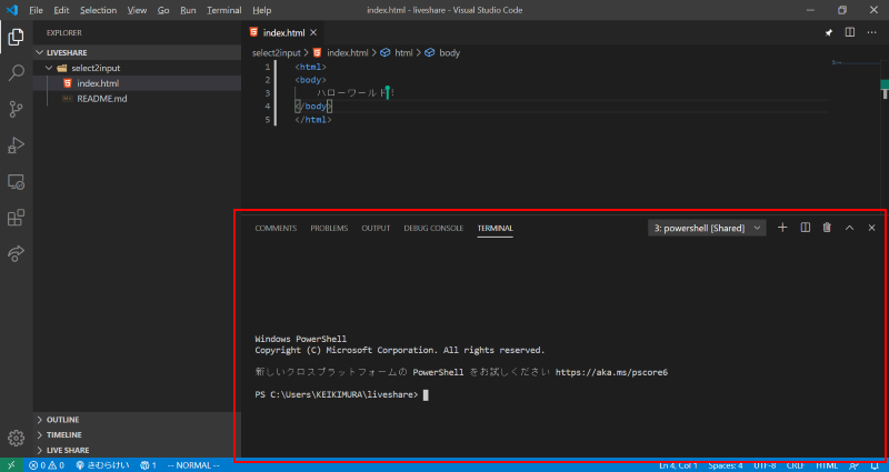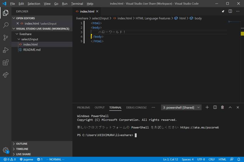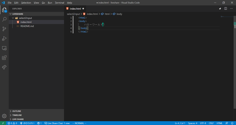 ・・・これが本来のスジであることは重々承知しているし、将来的に役立てることを意識するならこの形を学ぶべきだとは思っています。ただプログラミング初心者相手に半日~1日でここまでやるには少しハードルが高すぎる気がしています。環境準備段階でのハードルの高さもありますし、git も教えないといけないし、LiveShare 使うならアカウントから準備しないといけないし、その上でほぼ未経験のプログラミングをオンラインで・・・ 何を作るかにもよりますが、Hello World 程度すら厳しいかも。。