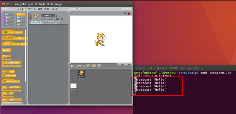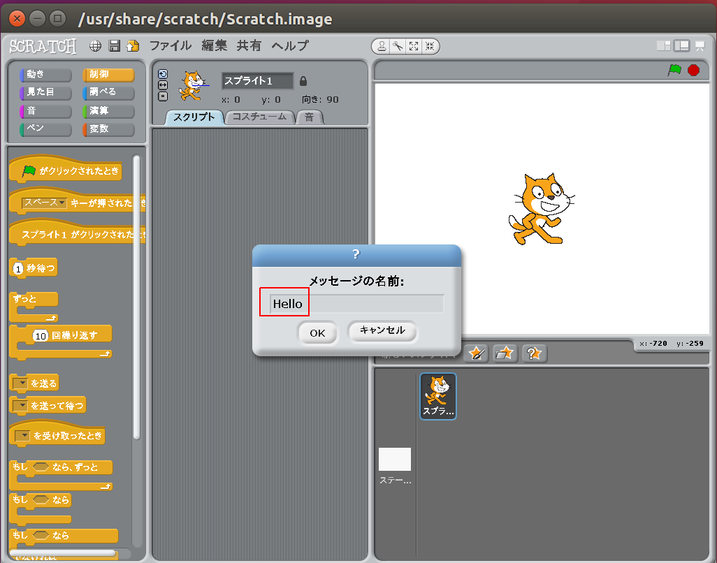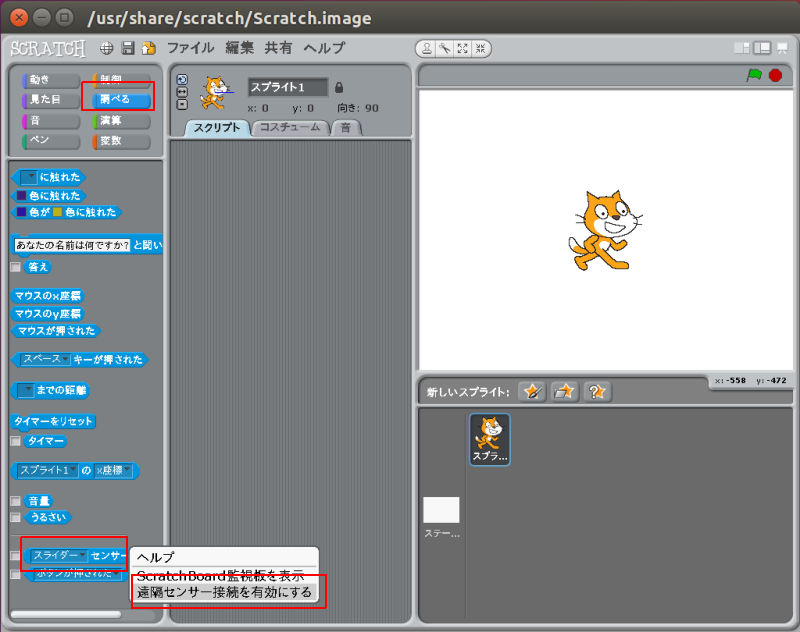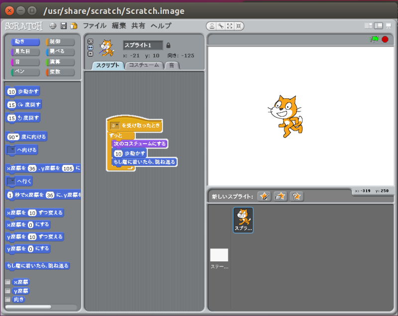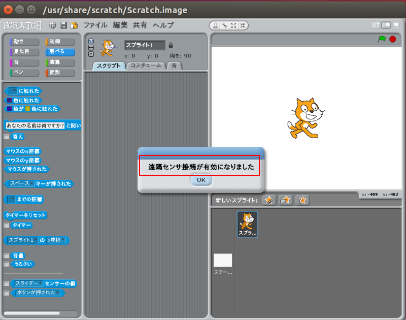 Scratch の編集画面が表示できました。各種ブロックを使って GUI プログラミングおよび動作確認ができます(共有機能は無効のようです):